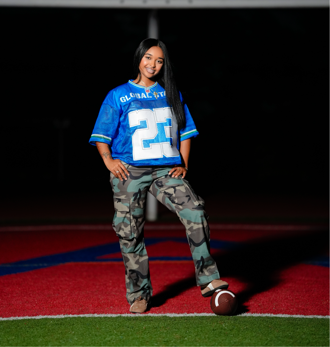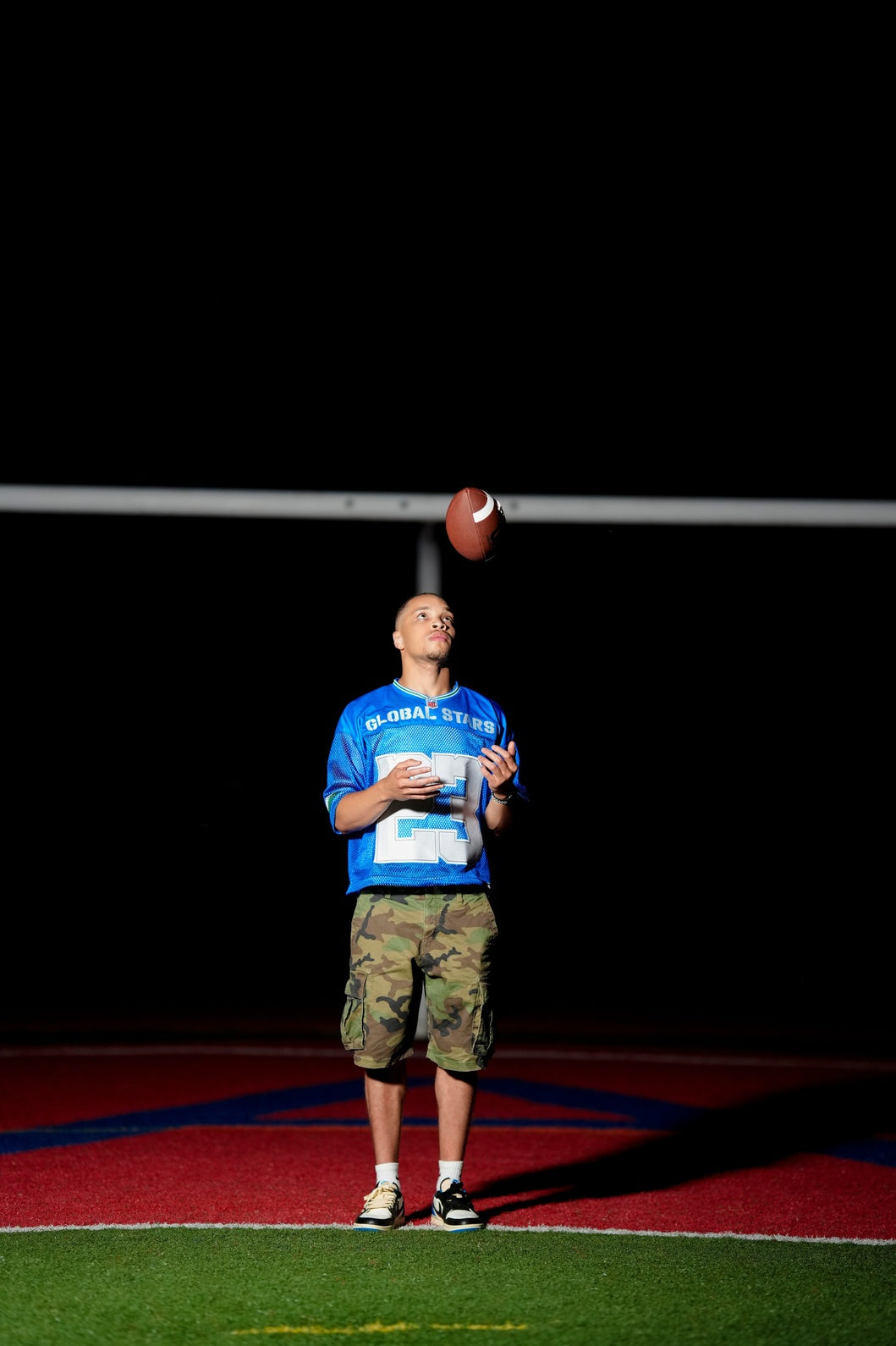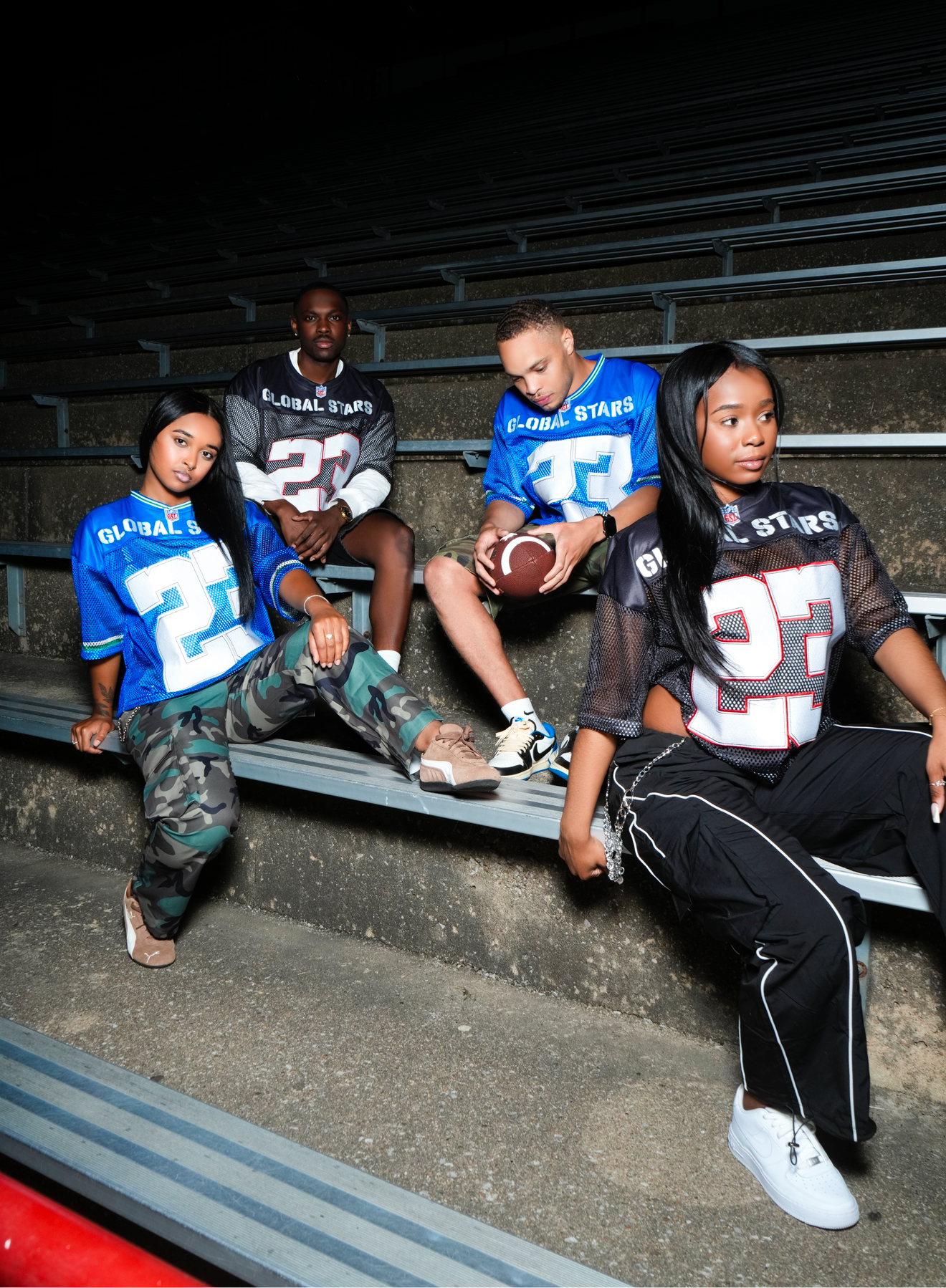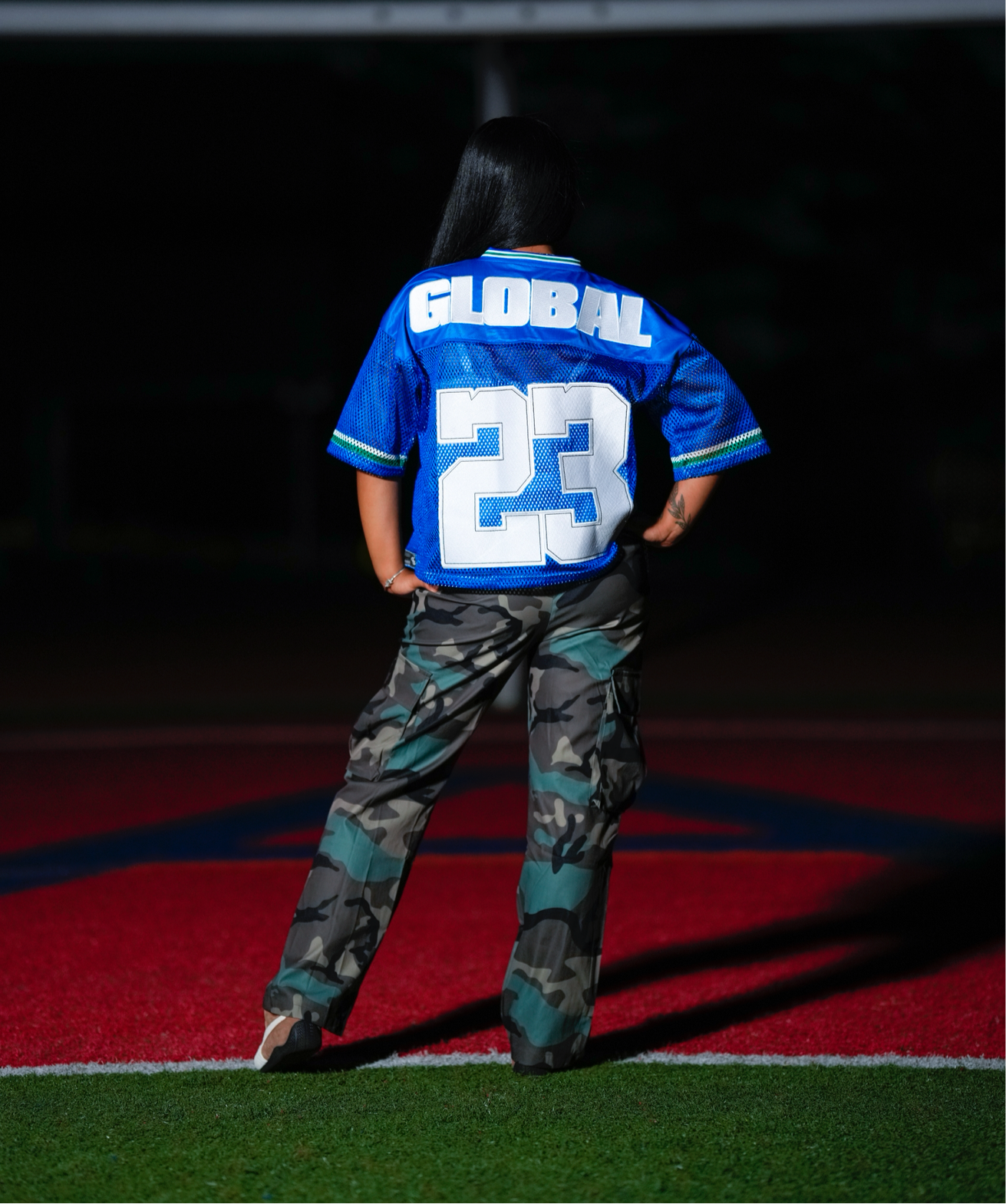 Featuring oversized tackle-twill embroidered numbers and “GLOBAL STARS” branding across the chest and back, this piece pays homage to athletic heritage while staying rooted in global street fashion.